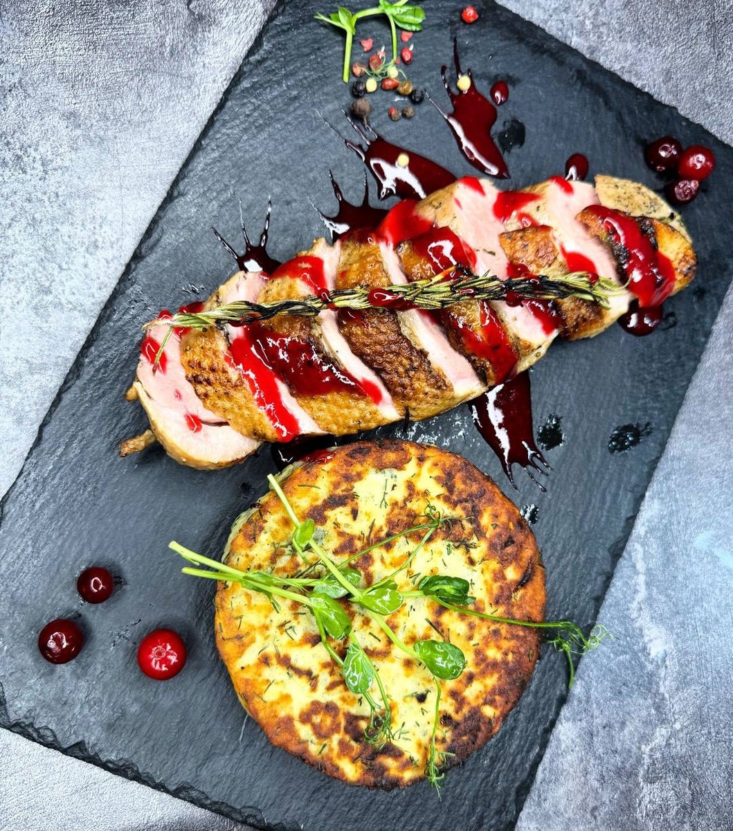 Потрясающее сочетание вкусов и текстур — грудка с соусом из клюквы, идеально дополняющая нежность мяса, и ароматный картофельный блин с