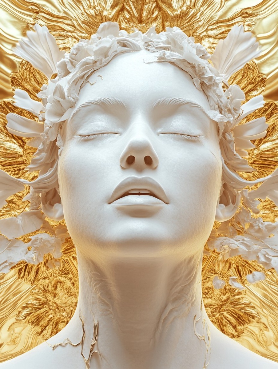 Создано на основе запроса: Frontal portrait of the goddess, hyper-realistic, white and gold colors, ultra-detailed, hyper-photorealistic, Octane render, studio lighting, golden background, cinematic, in the style of S. --- Автоперевод: Фронтальный портрет богини, гиперреалистичной, белой и золотой цветов, ультра-подготовленного, гиперфотореалистического, октанового рендеринга, студийного освещения, золотого фона, кинематографического, в стиле S. Как тебе такая генерация? 🤔 https://dzen.ru/id/65c0c65c86e4f837c27b24d7 #ИИ #AI #нейросеть #midjourney #art