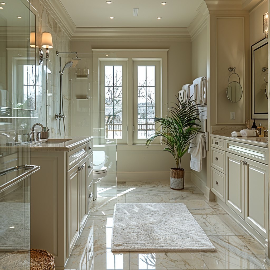 Создано на основе запроса: a luxurious remodeled bathroom with marble tile photographed ina magazine
