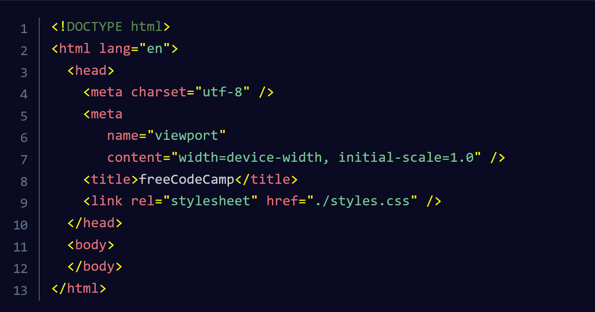 Давайте изучим шаблон HTML. Что такое HTML-шаблон, спросите вы? Это готовый шаблон для ваших веб-страниц. Подумайте о нем как о фундаменте дома. Шаблон включает в себя базовую структуру и основные элементы, необходимые каждому HTML-документу. Он экономит ваше время и помогает гарантировать, что ваши страницы настроены правильно. Вот пример: Давайте разберем ключевые части этого шаблона. Во-первых, это DOCTYPE декларация: Он сообщает браузерам, какую версию HTML вы используете. Далее следует html тег: Это охватывает весь ваш контент и может указывать язык вашей страницы. Внутри html тега вы найдете два основных раздела - head и body: Раздел head содержит важную закулисную информацию: Метаданные вашего сайта, содержащиеся в meta элементах, включают сведения о таких вещах, как кодировка символов и то, как веб-сайты должны предварительно просматривать ссылку вашей страницы. Заголовок вашего сайта, найденный в title элементе, определяет текст, который отображается на вкладке или в окне брау