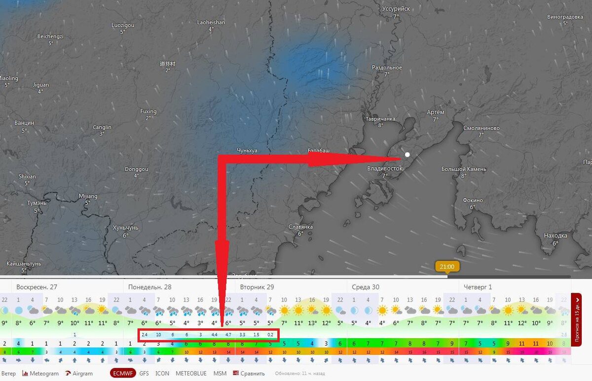 🔴🔴🔴🔴Синоптики резко ухудшили прогноз погоды во Владивостоке на начало следующей недели. В ночь с воскресенья на понедельник в столице Приморья начнется дождь, который достигнет своей максимальной силы ( более 10 мм за 3 часа и менее) к 7 часам утра. В дальнейшем сила осадков будет составлять примерно 5 мм за три часа и менее, а всего к семи утра 30 апреля во Владивостоке может выпасть не менее 35 мм осадков.