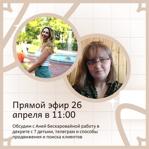 Эфир уже через полчаса! Приходите, мы с Аней Бескаровайной, арт-терапевтом и мамой, поговорим о том, ▫️как она справляется с семерыми и успевает работать, ▫️что мотивирует и из каких мешков брать на это силы, ▫️а ещё про мошенников, развитие в телеграме и много всего🫶 Начинаем в 11:00. Будем вам рады✨