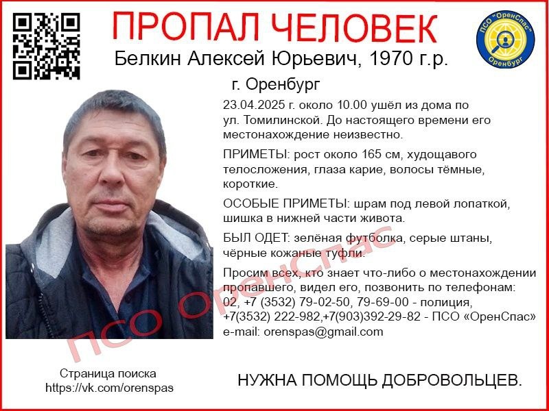 Внимание! Пропал человек, Белкин Алексей Юрьевич, 1970 г.р. г. Оренбург 23.04.2025 г. около 10.00 ушёл из дома по ул. Томилинской. До настоящего времени его местонахождение неизвестно. ПРИМЕТЫ: рост около 165 см, худощавого телосложения, глаза карие, волосы тёмные, короткие. ОСОБЫЕ ПРИМЕТЫ: шрам под левой лопаткой, шишка в нижней части живота. БЫЛ ОДЕТ: зелёная футболка, серые штаны, чёрные кожаные туфли. Просим всех, кто знает что-либо о местонахождении пропавшего, видел его, позвонить по телефонам: 02, +7 (3532) 79-02-50, 79-69-00 - полиция, +7(3532) 222-982,+7(903)392-29-82 - ПСО «ОренСпас» e-mail: orenspas@gmail.com