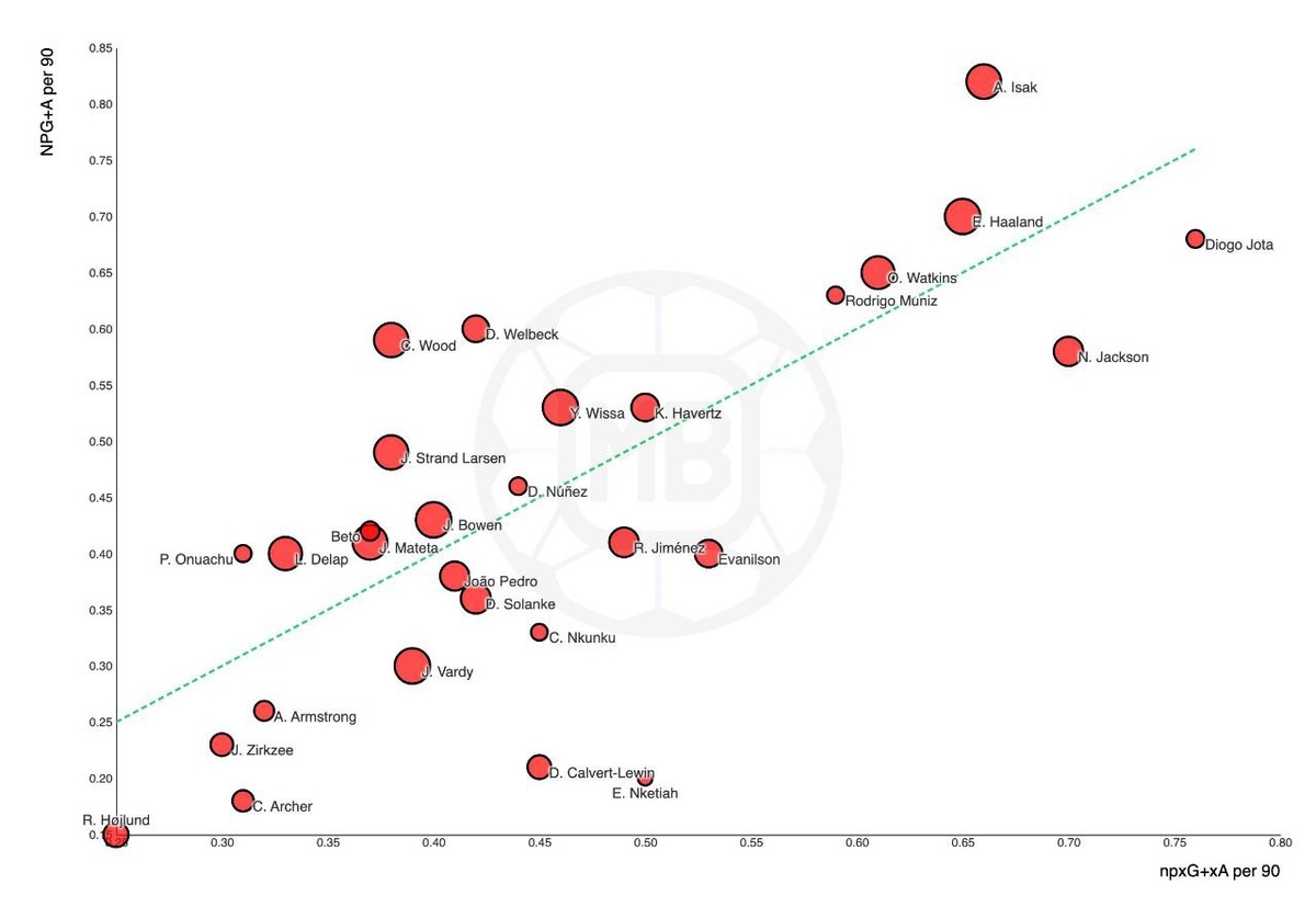 Сколько Нкунку нужно минут, чтобы его точка на графике хоть немного подвинулась? График показывает, насколько хорошо нападающие играют — сколько голов и голевых передач они делают без учёта пенальти на 90 минут ➡️ Ось X — сколько моментов они создают (npxG+xA per 90) 🔼 Ось Y — сколько реально забивают или отдают передачи (NPG+A per 90) 💫 Чем правее и выше игрок — тем он больше забивает и ассистирует. А все, кто находится выше линии "среднего", привносят буст выше ожидаемого ДжАксона за активность хвалим. Отметим так же Жоту, Исака, Холланда, Уоткинса и Муниза Ну а Нкунку... Единственное, что он успел, — это записать минуты в свою статистику 😂 @lookatfacts