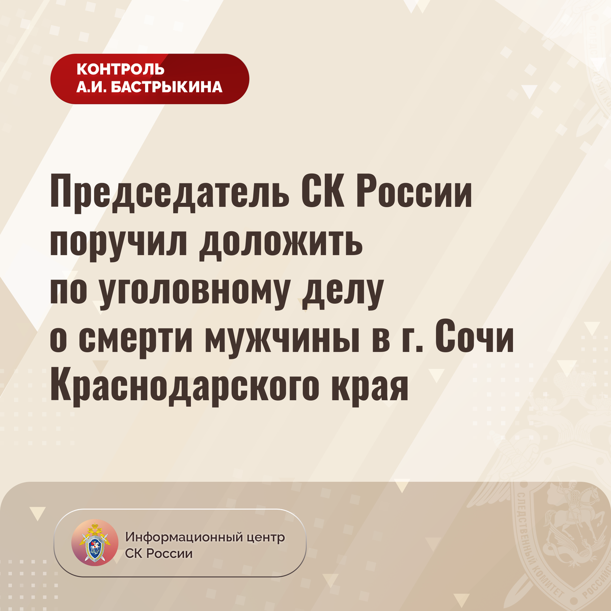 Председатель СК России поручил доложить по уголовному делу о смерти мужчины в г. Сочи Краснодарского края