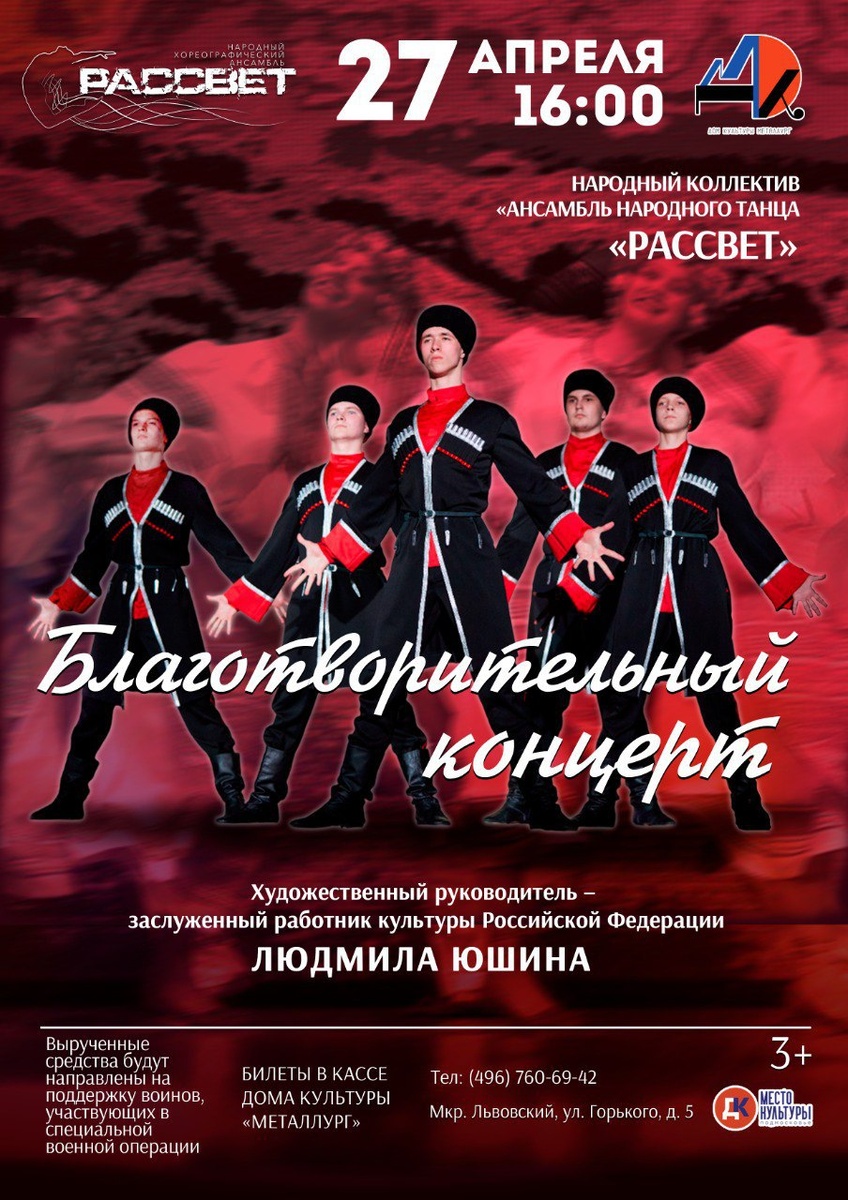 ✨ Благотворительный концерт ансамбля народного танца «Рассвет» в поддержку участников СВО ⚡Приглашаем вас посетить благотворительный концерт ансамбля народного танца «Рассвет». ❗ Все вырученные средства будут направлены на поддержку военнослужащих, принимающих участие в специальной военной операции. 🚫 Возраст: 3+ 📆 27.04.2025 🕒 16:00 🏢 Дом культуры «Металлург» 📍 г.о. Подольск, мкр-н Львовский, ул. Горького, д. 5 💰 Цена: 350 ₽ 🎫 Купить билет: clck.ru/3JCY6h #webПодольск #концертПодольск ✅ Мероприятия Подольск https://dzen.ru/id/66ed500f7b5671493eca3fd6 http://vk.com/podolsk_events http://dzen.ru/podolsk_events