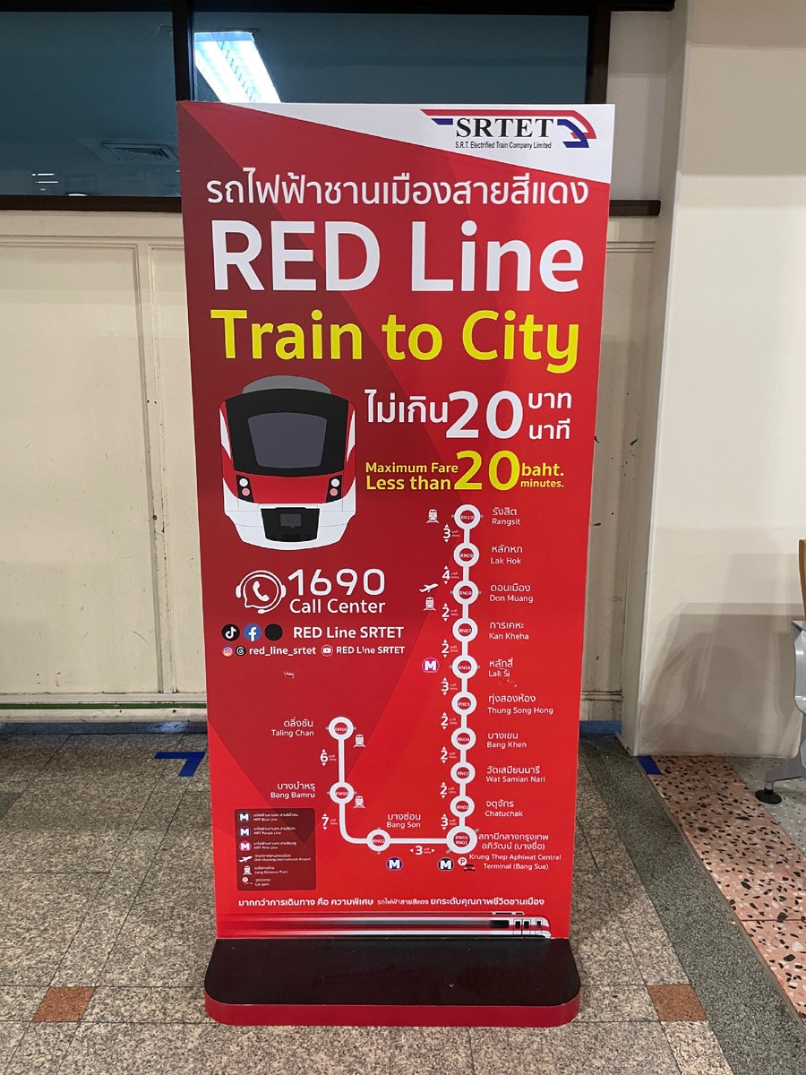 В этой статье расскажу вам как быстро и дешево (всего 65 бат ~ 180 рублей) доехать до центра Бангкока с помощью общественного транспорта. 1 шаг. Если вы прилетаете в Бангкок аэропорт Дон Муанг международный терминал T1, то после пограничного контроля вам нужно выйти из терминала, повернуть направо и перейти во внутренний терминал T2. Именно оттуда отправляется поезд до станции метро, где вы можете сделать пересадку и быстро без пробок доехать до центра города или любого другого места, куда вам нужно. В Аэропорту много табличек, и вам нужно ориентироваться на красный указатель поезда Red Line (см. фото выше). Идти через переходы до станции примерно 8-10 минут. Ориентируйтесь по указателям. 2 шаг: покупка жетона за 20 бат в терминале 3 шаг. Проходите по жетону (прикладываете его, но берете с собой. На выходе вам нужно будет вернуть его. Сохраните до конца поездки и не потеряете). 4 шаг. Подниметесь на платформу и ожидаете поезд. Ходят они достаточно часто. 5 шаг. Доезжаете до