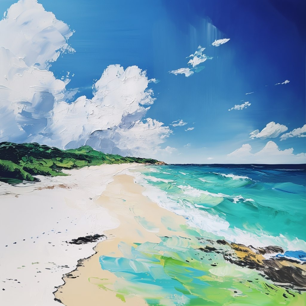Создано на основе запроса: Australian bush landscape painting, oil, impressionist, desert beach, bright white and blue sky, turquoise blue