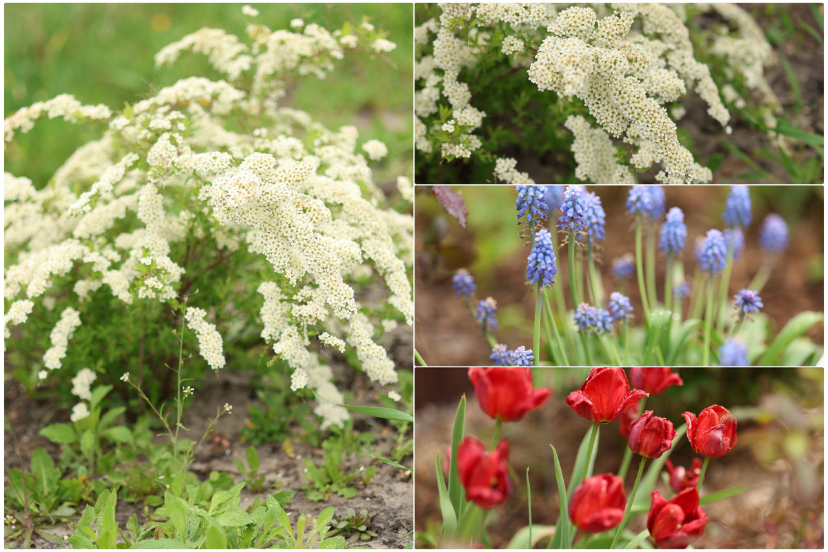 Очень быстро отцвели тюльпаны, а вот мускари радуют подольше. Радует цветением спирея.