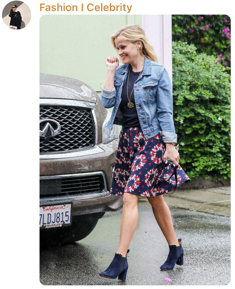 Риз Уизерспун — одна из тех голливудских актрис, чьи образы обычно становятся примерами для подражания. Но даже у самых стильных бывают промахи. Так, папарацци подловили актрису во время одной из прогулок, и на фото она в образе, который срочно стоит преобразить. На Риз — короткая пышная юбка с цветочным принтом, темно-синий топ, джинсовая куртка и ботильоны на каблуке в тон. В качестве аксессуаров — длинная подвеска, массивные солнцезащитные очки и ярко-красная сумка-тоут. Все вроде бы по отдельности вполне носибельно, но в комплекте — ощущение, что мы переместились на 20 лет назад. Образ получился провальным из-за устаревших сочетаний. Джинсовая куртка с закатанными рукавами, приталенная юбка с цветочным узором и ботильоны на толстом каблуке уже давно потеряли свою актуальность. Сегодня такие комбинации ассоциируются скорее с архивами Pinterest, чем с актуальными трендами. Особенно устаревшим кажется удлиненный кулон и ярко-красная сумка, визуально спорящая с остальными элементами ау
