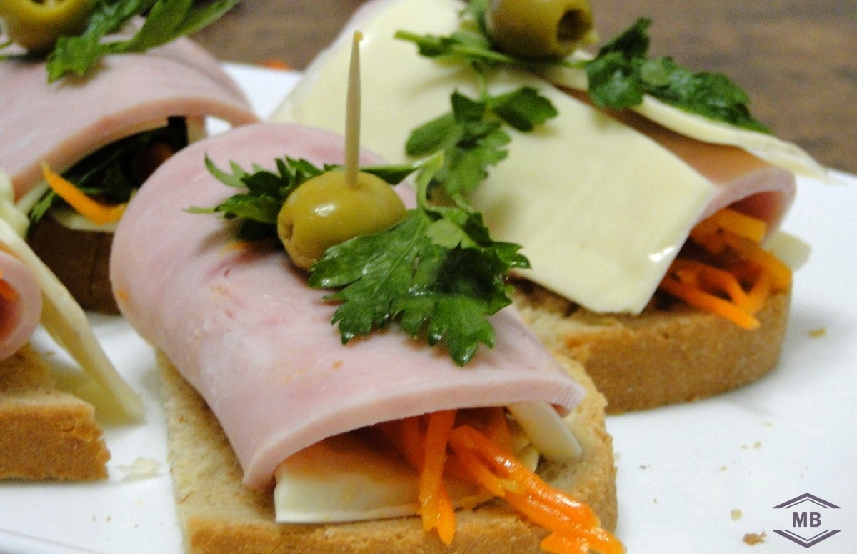 Из простых ингредиентов легко творить яркие блюда для семьи и гостей! Холодные закуски порадуют вкусом и простотой приготовления. Ингредиенты: 3 ломтика белого хлеба, 6 ломтиков ветчины, 6 пластин плавленного или твёрдого сыра, 6 столовых ложек моркови по-корейски, 6 листов салата или петрушки, 6 оливок, 6 шт зубочисток или шпажек, зелень - для украшения. Процесс приготовления: Белых хлеб поджариваем в тостере или на сковородке. Разрезаем каждый ломтик на пополам. На ломтик ветчины кладём ломтик сыра. На сыр - зелень и лист салата, на него - ложку морковки по корейски. Сворачиваем всё в рулет и фиксируем шпажкой с оливкой. Заготовку фиксируем на батоне и украшаем зеленью. Так поступаем со всеми ингредиентами, можно поменять местами ветчину и сыр. Перекладываем холодные закуски на сервировочное блюдо и угощаем собравшихся за столом. Приятного аппетита и удовольствия от вкуса новых блюд!