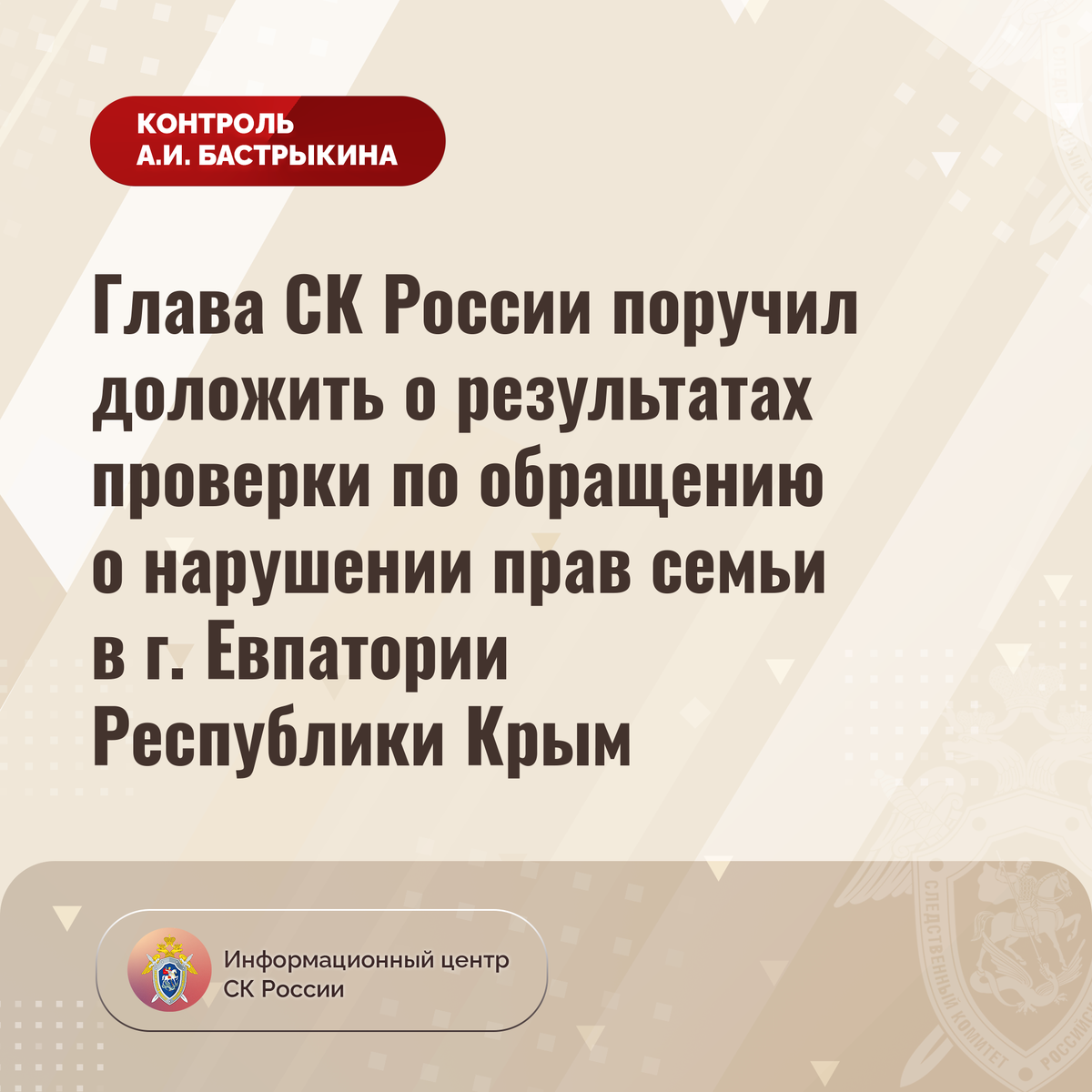 Глава СК России поручил доложить о результатах проверки по обращению о нарушении прав семьи в г. Евпатории Республики Крым