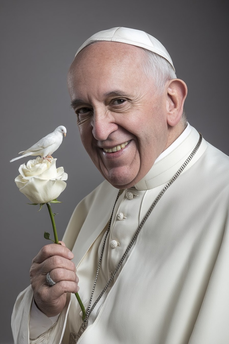 Создано на основе запроса: a photo of Pope Francis , smiling, happy, great illumination, a beautiful white rose , a beautiful dove ,total