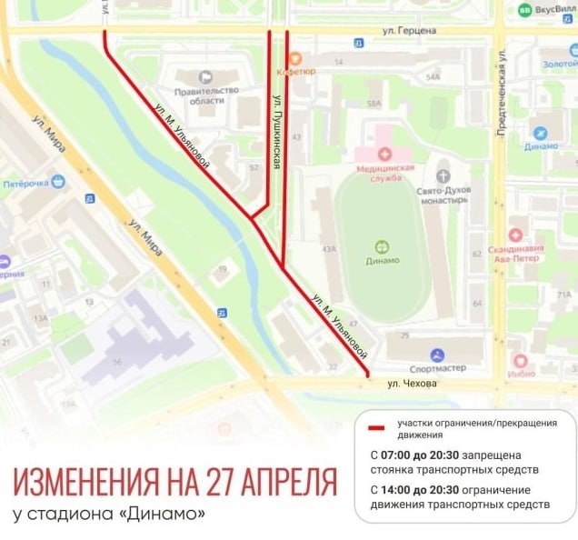 В связи с проведением футбольной встречи между вологодским «Динамо» и «Спартаком-2», на улицах Марии Ульяновой и Пушкинской вводятся ограничения: