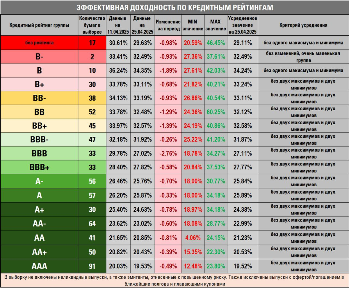 на 2️⃣5️⃣🍀0️⃣4️⃣🍀2️⃣0️⃣2️⃣5️⃣ 🤗 Доброе утро, друзья! Пара недель миновала с момента последнего мониторинга доходностей, самое время освежить эти данные :) ⭐️ За 14 дней доходности бумаг с фиксированными купонами стали еще менее интересны - цифры становятся все ниже, почти на процент в среднем по всем группам. При этом, напомню, ключевая неизменна, а ЦБ продолжает настаивать на том, что высокая ставка по сути сохранится как минимум до конца года. Я отталкиваюсь от того, что между 19 и 21%, допустим, разница практически отсутствует. ▶️ Фиксы в таком настроении рынка покупать не очень хочется - я избалован прошлыми значениями и по сути забил портфель до предела :) Однако, если жить без них нет сил, то табличка с лидерами доходностей рейтинговых групп вам поможет. 🥱 Столкнулся я с тем, что она получается скорее полезной для общего развития, чем интересной - в наивысших рейтингах во главе списка не очень ликвидные бумаги, да еще и с выплатами два раза в год. Поэтому в эти выходные отпра
