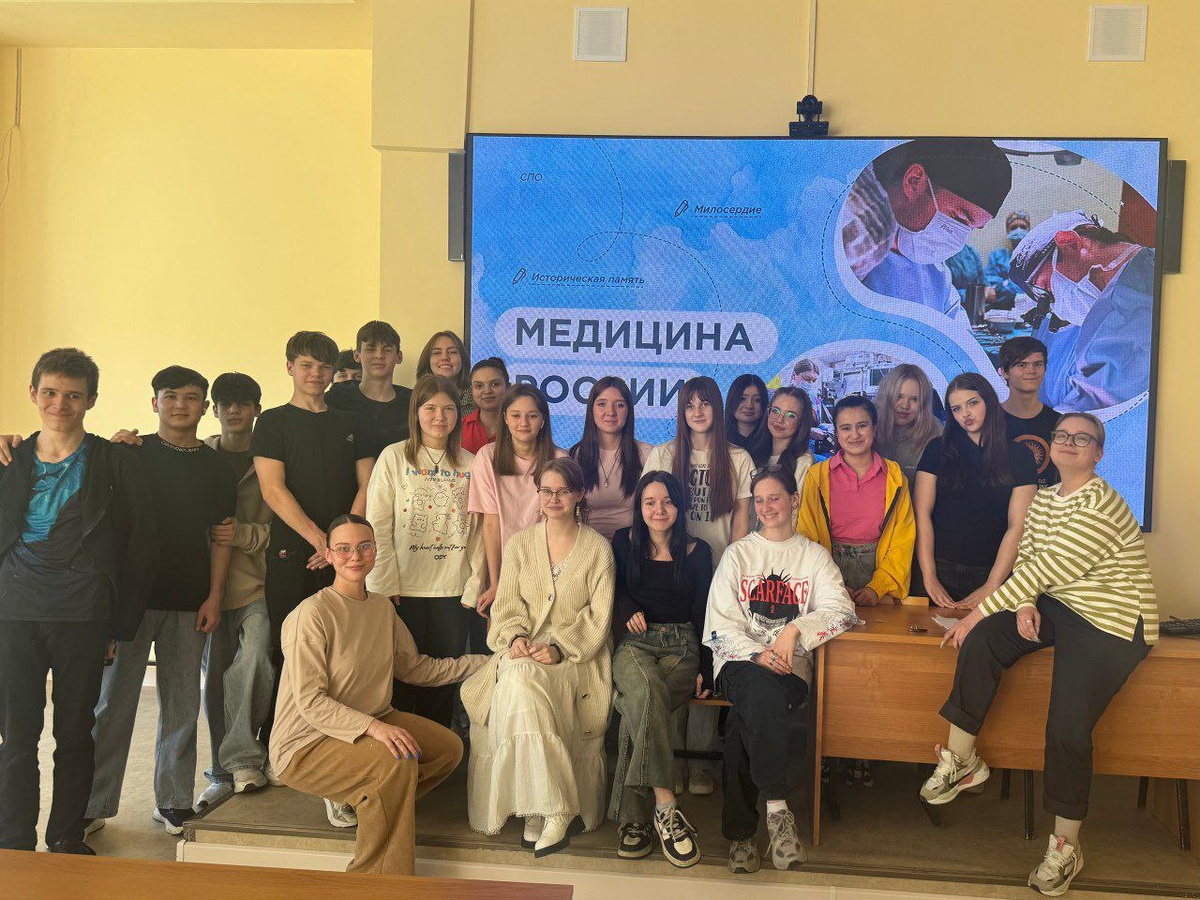 В колледже организовали метапредметный проект «Код профессионала» в рамках цикла «Разговоры о важном». 24 апреля нашем колледже прошло занятие для обучающихся специальностей «Сестринское дело» и «Адаптивная физическая культура» — метапредметный проект «Код профессионала», посвященный медицине России в рамках цикла занятий «Разговоры о важном». Целью занятия было формирование у обучающихся понимания значимости медицины для общества и государства, осмысление нравственной стороны работы врачей и медицинских работников, а также знакомство с современными достижениями российской медицины. Ребята узнали о различных видах медицинской помощи и новейших методах лечения, внедряемых в России. Особое внимание было уделено нравственной ответственности врачей и важности их человеческого отношения к пациентам. Мероприятие организовано заместителем директора по НМР Ульяной Борисовной Ивановой совместно с преподавателем Екатериной Сергеевной Кирилловой. #КодПрофессионала #Разговоры_о_важном #Медиц