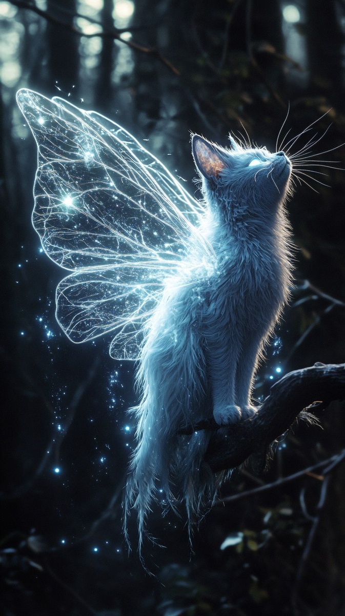 Создано на основе запроса: Floating moth-cat hybrid with glowing wings, sparkling dust trailing behind, perched on a wizard's shoulder