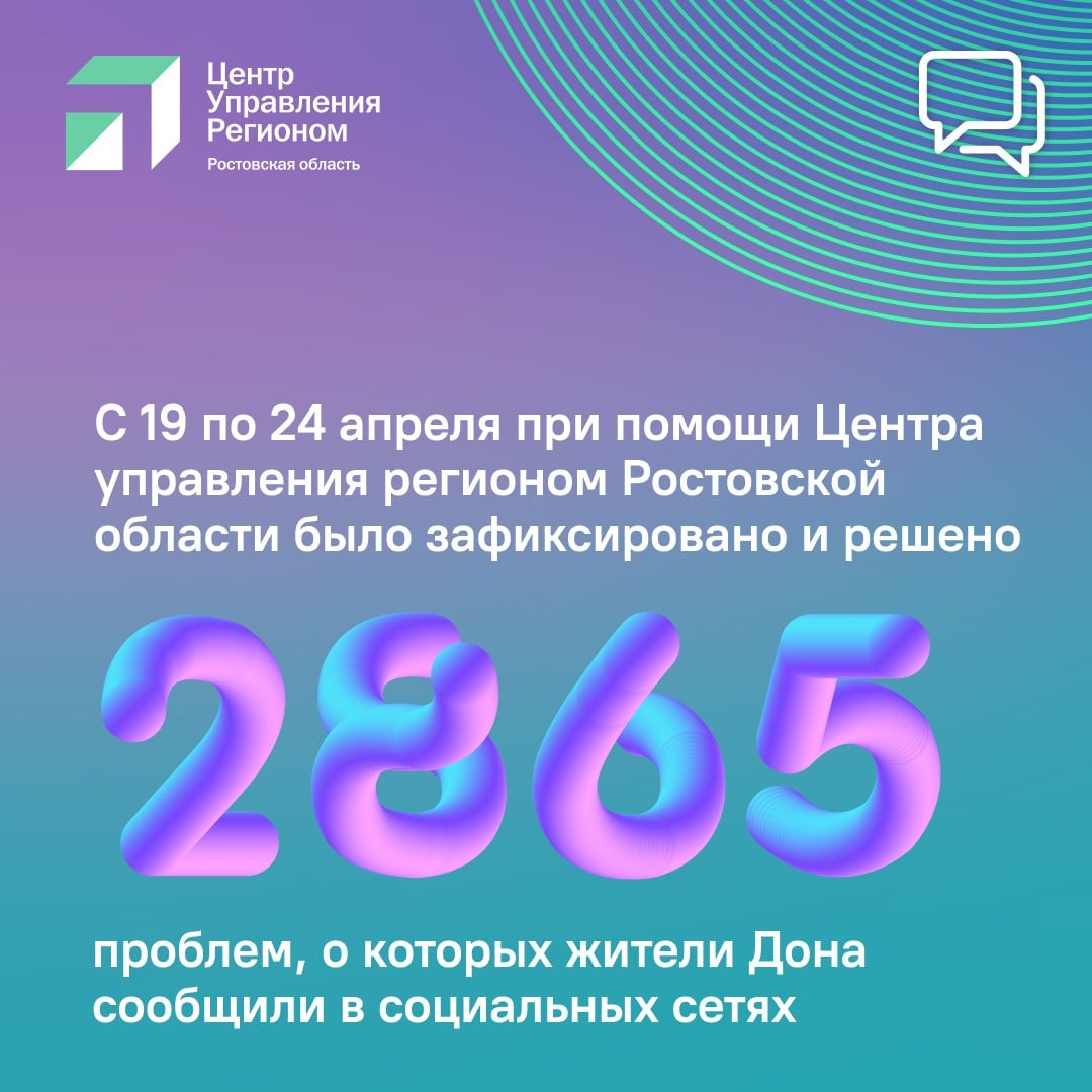 📲Публикуем статистику решенных вопросов за неделю! ✔️С 19 по 24 апреля 2025 года при помощи Центра управления регионом Ростовской области было зафиксировано и решено 2865 проблем, о которых жители Дона сообщили в социальных сетях. Подробнее - в карточках📝 #цур61 #решаемвместе61 #цурвцифрах #ростовскаяобласть