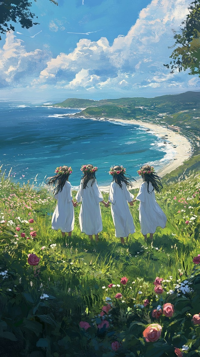 Создано на основе запроса: Illustrate a wide grassy field overlooking the ocean, where small roses are blooming across the landscape. In the center, four 20-year-old women wearing white cloth and flower crowns are holding hands and forming a circle. The atmosphere is serene, magical, and filled with the gentle warmth of the sea breeze. --- Автоперевод: Иллюстрируйте широкое травянистое поле с видом на океан, где цветут небольшие розы через ландшафт. Как тебе такая генерация? 🤔 https://dzen.ru/id/65c0c65c86e4f837c27b24d7 #ИИ #AI #нейросеть #midjourney #art