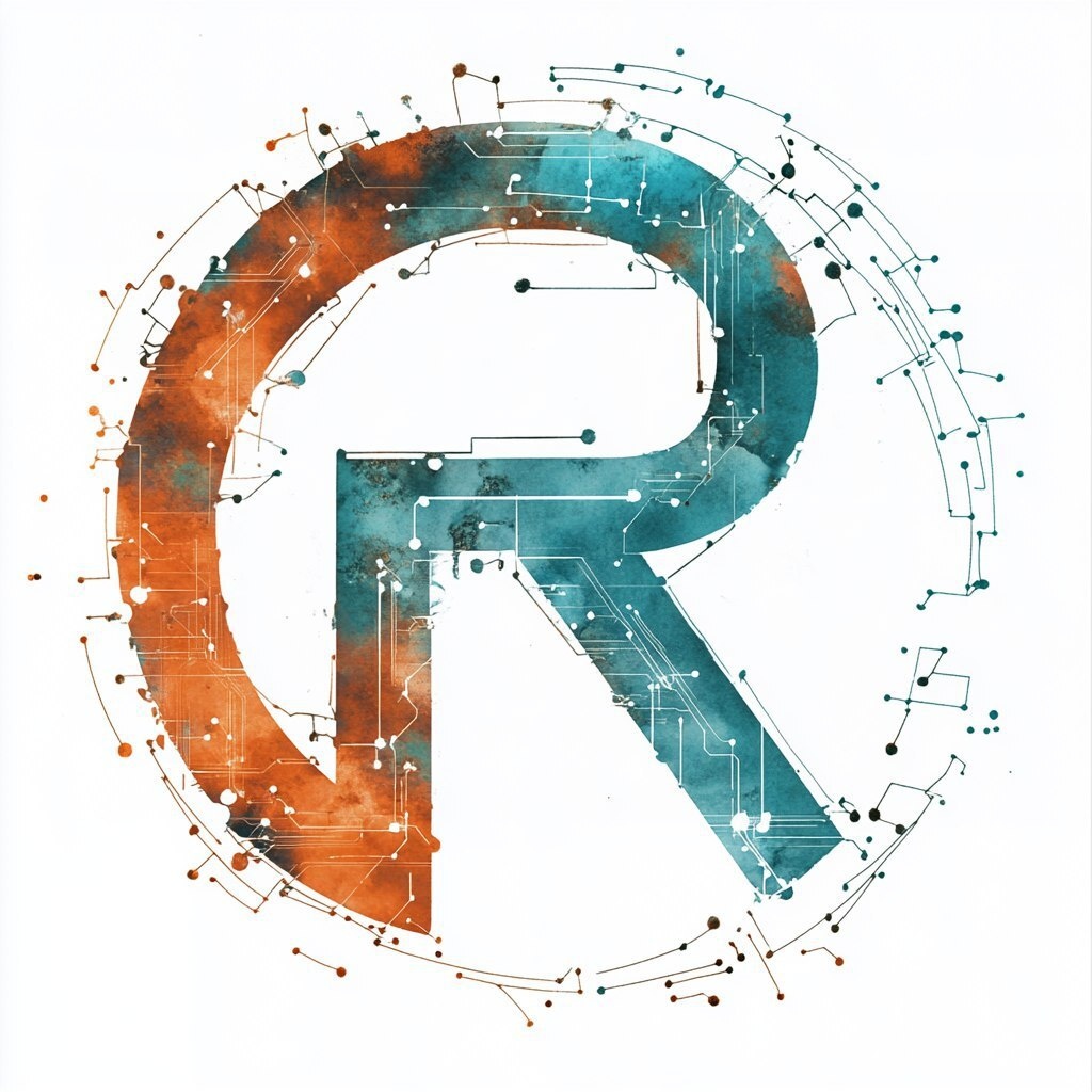 Создано на основе запроса: a enso circle logo that says "R" with cyan and rust colors, networks of shapes and circuit board
