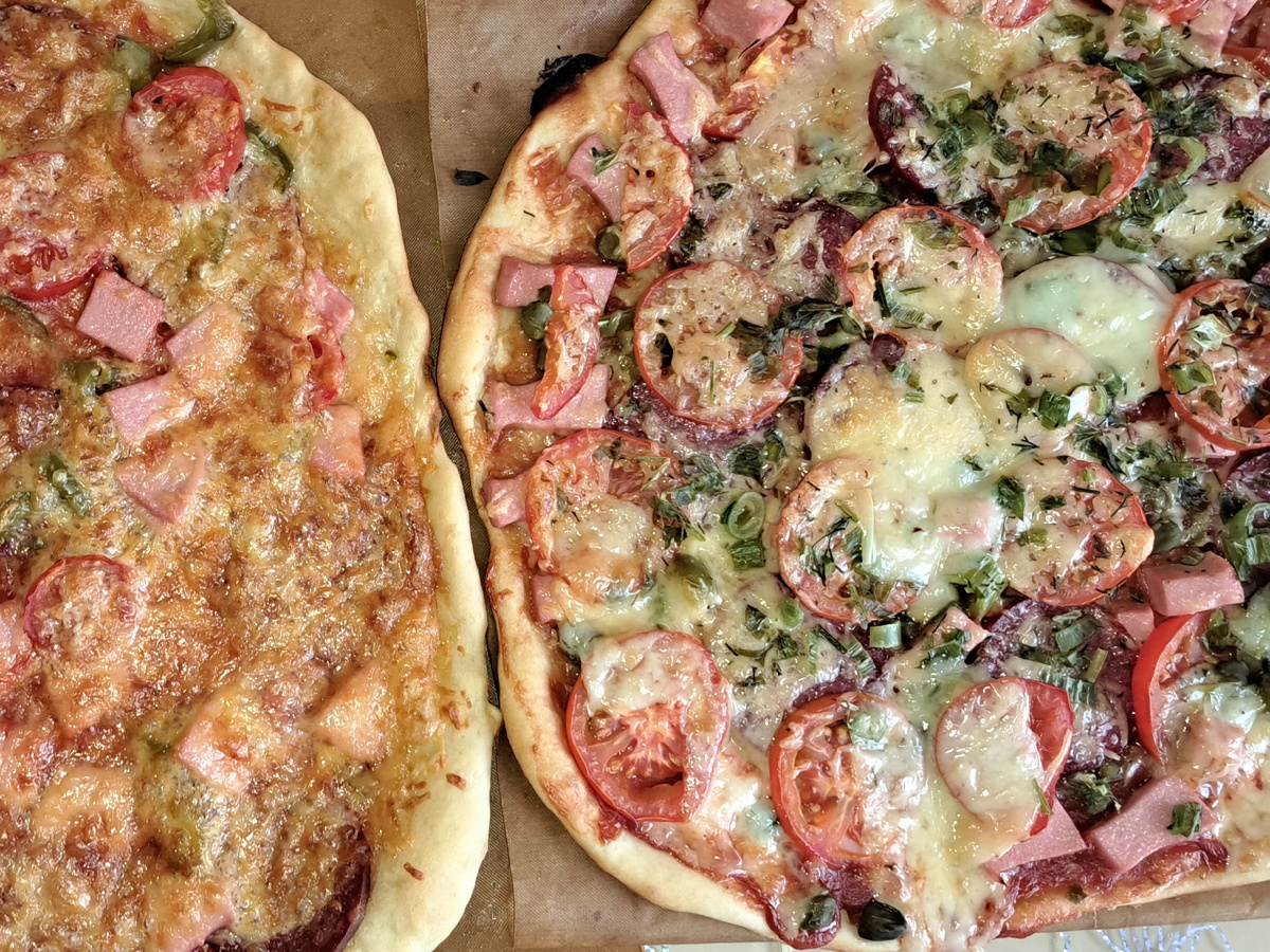 Всем друзья огромный привет!И хороших выходных!Сегодня суббота,наконец-то решили отдохнуть и встретиться с друзьями Олей и Геной.На улице похолодало и они придут к нам в гости. Поэтому надо приготовить что-то вкусненькое.Сделала две пиццы.Тесто обычное дрожжевое,замесила немного,на стакан воды.Для этого чайную ложку сухих дрожжей +2ст ложки сахара +щепотка соли растворила в тёплой воде ,всыпала 1,5стакана муки и 2ст ложки масла.Замесила тесто,поднялось оно у меня быстро.,разделила на два комочка и раскатала на круги.Для начинки взяла колбаску варёную и копченую,помидоры.Тесто смазала кетчупом,разложила колбасу,помидоры,перец маринованный из банки с соленьями ,посыпала сыром и зеленью.Запекала при 200градусов по 15 минут каждую.Получилось очень 😋