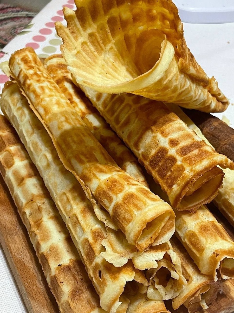 Вафли өчен: 5 йомырка 180 гр песокны , әз генә тоз салып миксер белән күпертәбез. 180 гр эретелгән ак май, 2 аш кашыгы каймак, ярты чәй калагы разрыхлитель он салып камыр ясыйбыз. Теләгән кеше ванилин сала. Камырны сметана куелыгында ясыйбыз. Кызган табага салып пешерәбез. Мәрьям Миңнегулова