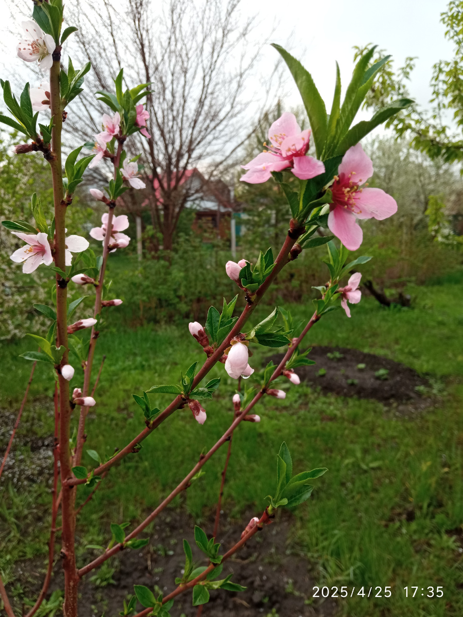 Дорогие друзья! Этой весной у меня большая радость - зацвёл наш персик. Сорт персика называется Гринсборо. Мы посадили 2-х летний саженец осенью 2021 года. Гринсборо - это старинный американский сорт, который вывели в 1891 году. А в 1947 году его одобрили для возделывания на территории Северо-Кавказского региона. Позже сорт начали выращивать в южных и центральных областях РФ и в Подмосковье. Добрался этот сорт персика и до нашего Среднего Поволжья. В первые два года у нашего персика подмерзали побеги, я уже и не надеялась, что выживет. В прошлом году пошли хорошо расти молодые ветви. Я формировала крону дерева в виде чаши. Все ветви, смотрящие внутрь удаляла. Вот так выглядел персик прошлым летом. Зима в этом году была не сильно морозная. Сорт Гринсборо считается зимостойким видом плодовой культуры. Его деревья способны выдерживать холод до -22°С. Все ветви перезимовали, кроме одной, у которой почки пока не проснулись. Возможно ещё отойдет. Такие милые розовые цветочки, про