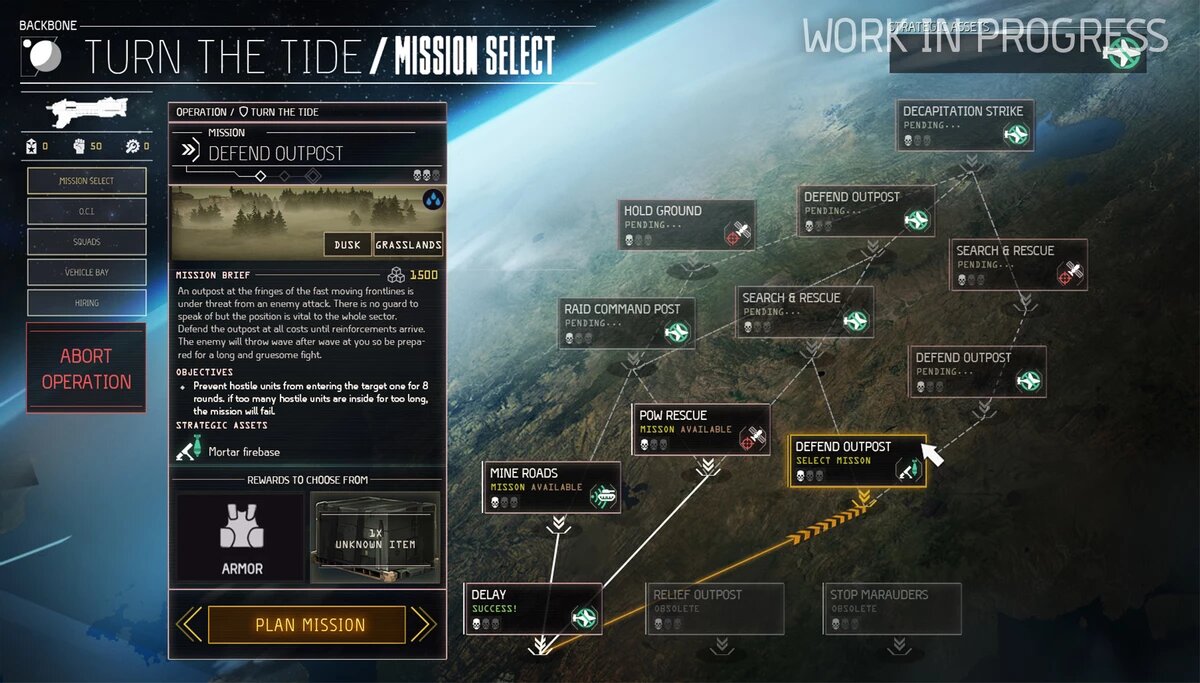 Студия-разработчик раскрыла подробности о системе операций в игре Menace. Это механика, которая объединяет отдельные миссии в единую сюжетную линию с процедурной генерацией. Операция представляет собой цепочку из 3-5 тактических миссий, связанных между собой как ветки дерева. Игрок самостоятельно выбирает путь продвижения, но при этом на каждом уровне можно пройти только одну миссию. Все потери накапливаются и переносятся между миссиями, а погибшие командиры и уничтоженная техника не восстанавливаются. За успешное прохождение всей операции игроки получат редкие очки OCI для прокачки ударного крейсера, авторитет для поддержания дисциплины экипажа и повышение доверия фракции Вейбэк. Каждая выполненная миссия приносит очки для прокачки командиров, стратегические активы и различное снаряжение с оборудованием. В игре будет присутствовать система стратегических и вражеских активов. Они действуют на протяжении всей операции и включают в себя минометные базы поддержки, разведывательные сети, л