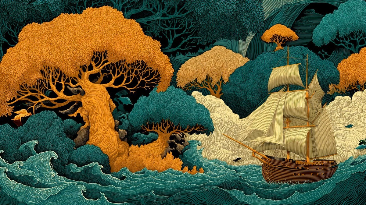 Создано на основе запроса: Visualize a striking surrealist poster where the seashore-drawn becomes a portal to a fantastical realm. Their waves dissolves into a dense, billowing cloudscape, its vaporous texture morphing into a floating island of ancient, towering oak trees with roots that fray into mist. Nestled within the cloud, a majestic galleon with sails like crumpled parchment sails silently through the arboreal sky, its masts brushing against golden leaves. Surround the scene in a steampunk haze, blending twilight hues of amber, emerald, and indigo to evoke both calm and boundless adventure. --- Автоперевод: Визуализируйте поразительный сюрреалистический плакат, где нарисованные морскими морями становится порталом в фантастическую сферу. Как тебе такое изображение? 🤔 https://dzen.ru/id/65c0c65c86e4f837c27b24d7 #ИИ #AI #нейросеть #midjourney #art
