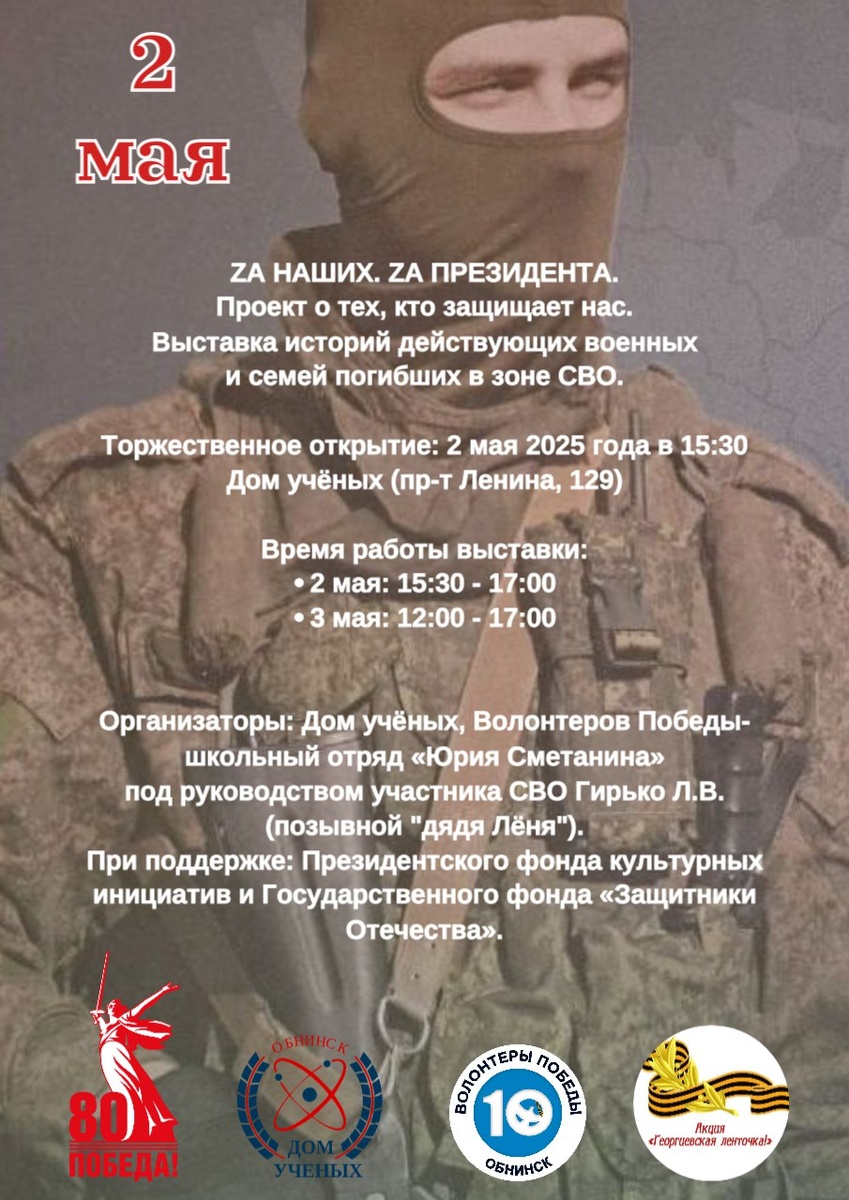 2 и 3 мая в Доме ученых будет представлен проект о тех, кто защищает нас. Выставка историй действующих военных и семей погибших в зоне СВО. ⚡Торжественное открытие 2 мая в 15:30. Время работы выставки: 2 мая: 15:30 - 17:00 3 мая: 12:00 - 17:00 Они сражались за будущее нашей страны. Они — наши Герои. Эта выставка — дань уважения тем, кто защищает нас, рискуя своей жизнью. Здесь вы услышите истории мужества и самопожертвования, рассказанные от первого лица. На выставке представлена экспозиция с историями участников СВО и семей погибших солдат. Вход свободный. Обнинск, пр-т Ленина, 129. 👍 Подписаться | Прислать мероприятие