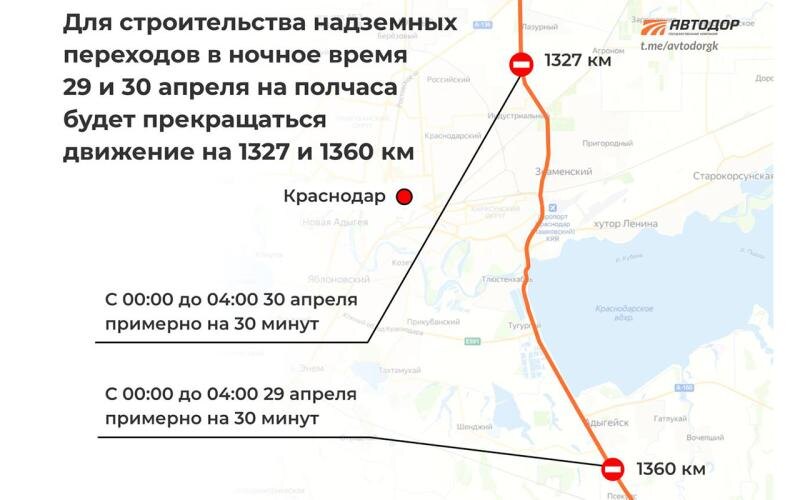 Для монтажа пролетов габаритных ворот пешеходных переходов в ночь с 28 на 29 апреля в промежутке с 00:00 по 04:00 сроком до 30 минут запланировано перекрытие движения на 1 360 км в районе Адыгейска. В ночь с 29 на 30 апреля ограничения коснутся участка 1 327 км автодороги М-4 «Дон» в Краснодарском крае, на Восточном обходе Краснодара. Водителей просят учитывать данную информацию при планировании поездок. Ранее портал ЯСНО сообщал о том, что вместо действующих наземных пешеходных переходов будут возведены два современных модульных металлических перехода на участках км 1387 (микрорайон Заречье) и км 1390 (зона отдыха «Старый Замок»). Это даст возможность убрать светофоры, что значительно разгрузит участок с интенсивным трафиком. Новые переходы оборудуют навесами, что сделает их использование удобным в любые погодные условия. Завершение всех работ запланировано на 2025 год.