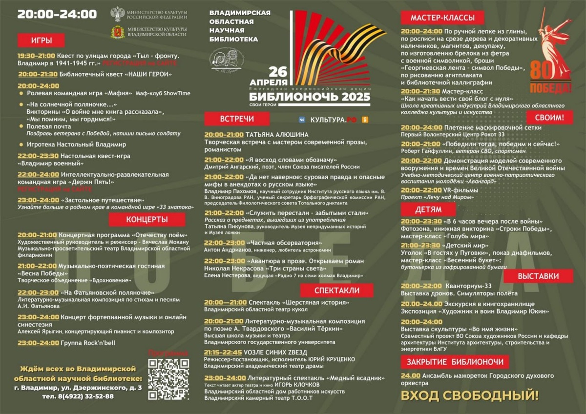 Программа «Библионочи-2025» во Владимире Сегодня во Владимире пройдет ежегодная культурная акция «Библионочь-2025». В этом году она посвящена 80-летию Победы советского народа в Великой Отечественной войне. Основные мероприятия будут проходить в областной научной библиотеке на улице Дзержинского, 3. К акции также присоединится Владимирская библиотека для детей и молодежи. Рассказываем, что интересного вас ждет.