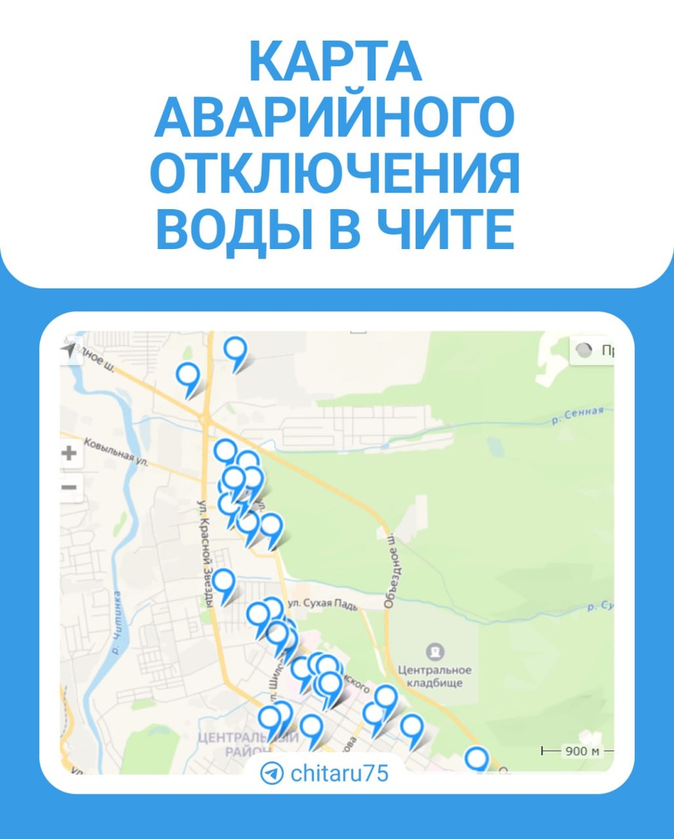 Кто без воды? Все из-за аварии на сетях «Водоканала». Из комментариев читинцев на @chita.ru получилась карта на 34 адреса. Кроме жилых домов, воды нет в Краевой клинической больнице, в перинатальном центре и в городском роддоме № 1. В Минздраве сообщили, что там уже был подвоз: Все емкости в медучреждениях заполнены. В краевом перинатальном центре сейчас пациентов нет, он закрыт на помывку, там сделали запас. Ситуация по всем объектам под контролем. Если где-то вода закончится, а с аварией к этому времени не разберутся, «Водоканал» привезет еще. 🟦 Подписаться | Предложить новость
