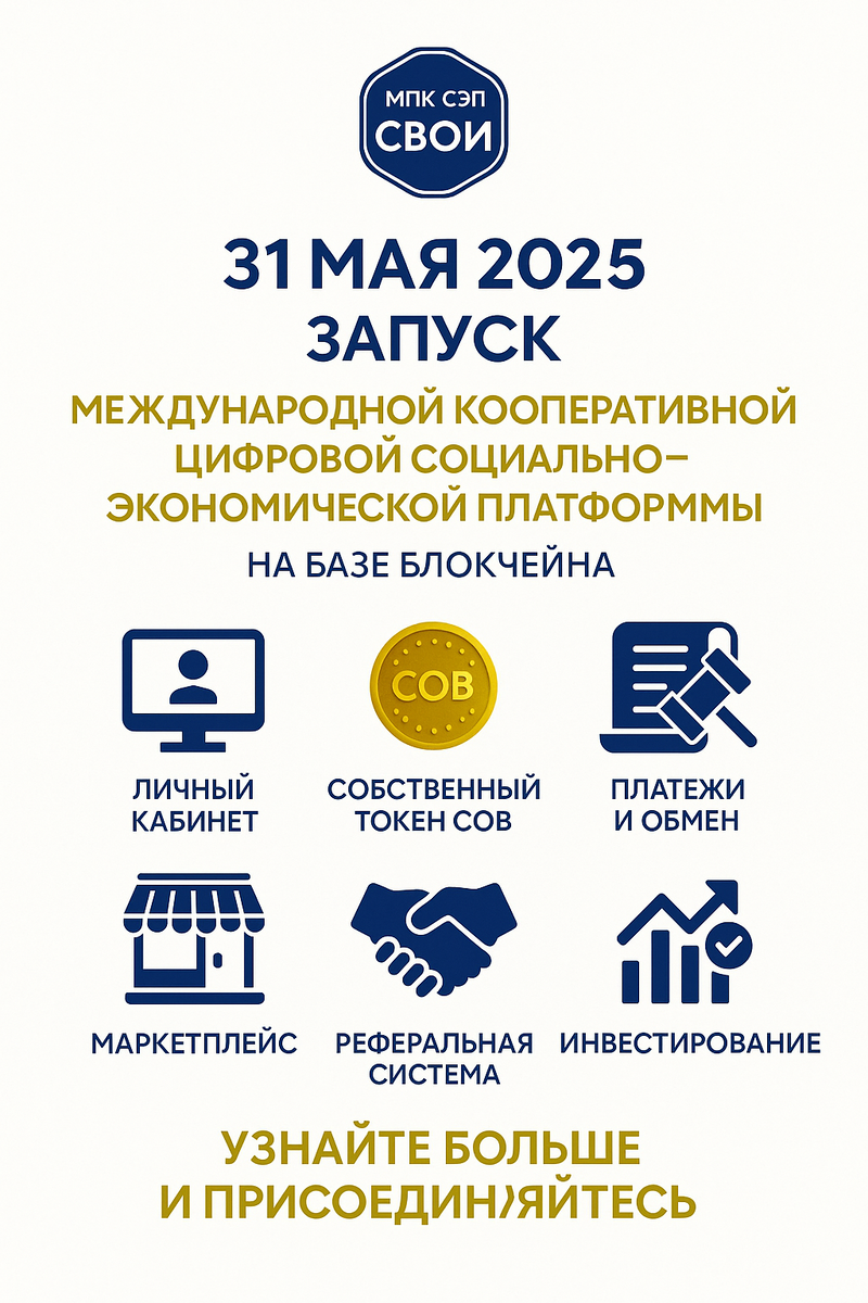Приветствую! Меня зовут Павел Сергеевич Тараненко, я председатель правления МПК СЭП «СВОИ». Уверен, у нас с вами есть общее — забота о будущем своих близких и желание строить экономику, основанную на справедливости, надёжности и независимости. Именно поэтому я хочу поделиться с вами важной новостью. 31 мая 2025 года мы запускаем уникальную Международную Кооперативную Цифровую Социально-Экономическую Платформу на базе технологии блокчейн. Это полностью наше авторское программное обеспечение — результат многолетней работы и интеллектуальной собственности нашего кооператива (ИНН 2311342233, зарегистрирован 30.11.2022). Мы создаём пространство для взаимодействия пайщиков, потребителей, производителей и инвесторов. Платформа обеспечивает 100% финансово-экономическую независимость от банковской системы, работает без налогов внутри кооператива и предлагает уникальные возможности: Мы открыты к сотрудничеству по всему миру — для нас не существует границ. Выплаты паевых взносов — по договору: ра
