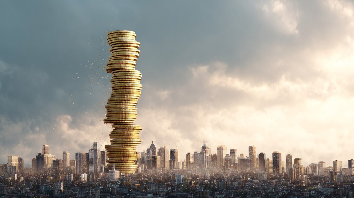 Создано на основе запроса: city landsape, giant stack of golden coins threatening to fall