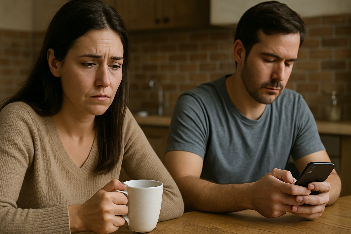 Вот он сидит рядом, а ощущение, что между вами — километры. Он спрашивает, как у тебя день прошёл, но голос у него такой... чисто для галочки. Ты рассказываешь, а он кивает, глядя куда-то мимо. Не потому что устал — хотя он скажет, конечно, что устал. А потому что ему всё равно. Ой, звучит жёстко, знаю.