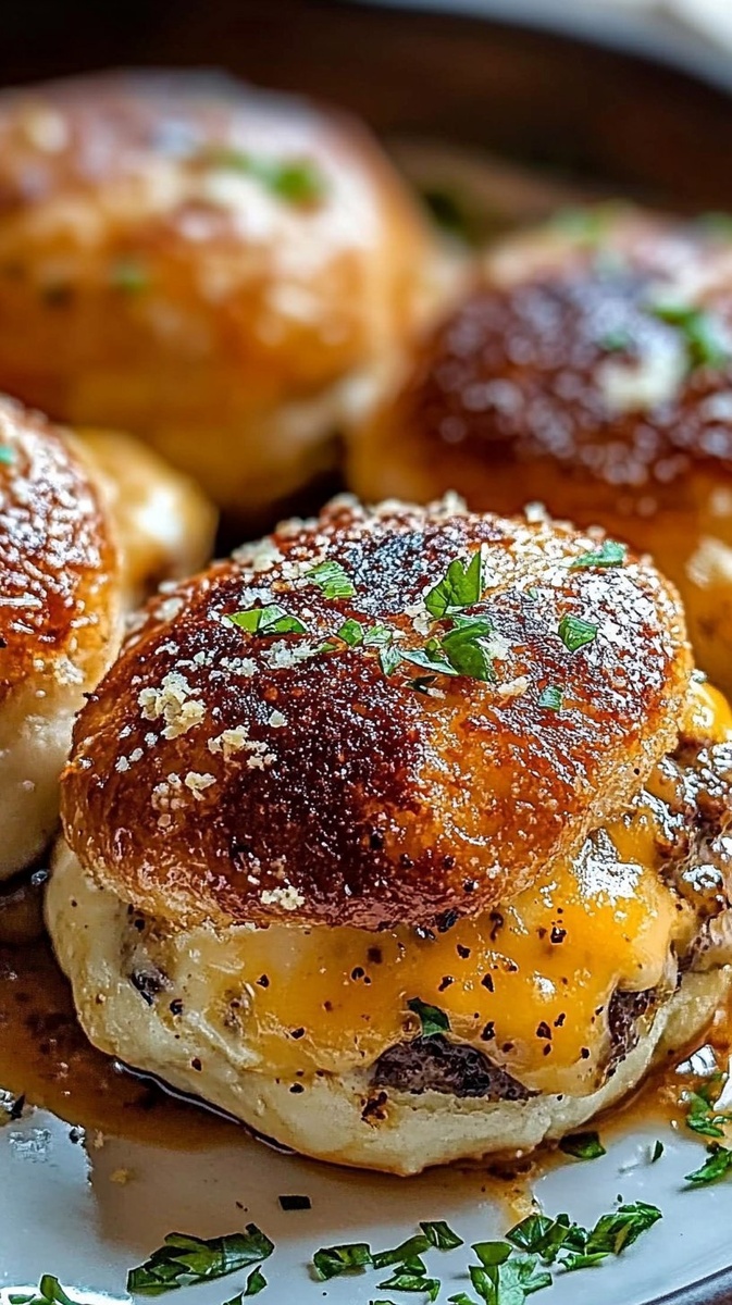 Создано на основе запроса: | Title: Golden-brown Garlic Parmesan Cheeseburger Bombs | Close-up Shot right view, taken by a photographer with
