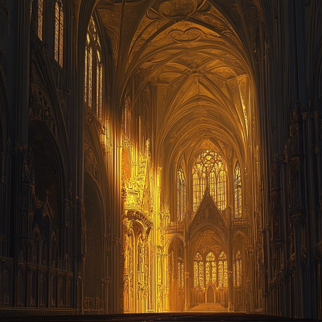 Создано на основе запроса: Cathedral In Gold Light And Dark Laserilluminated Photorealistic