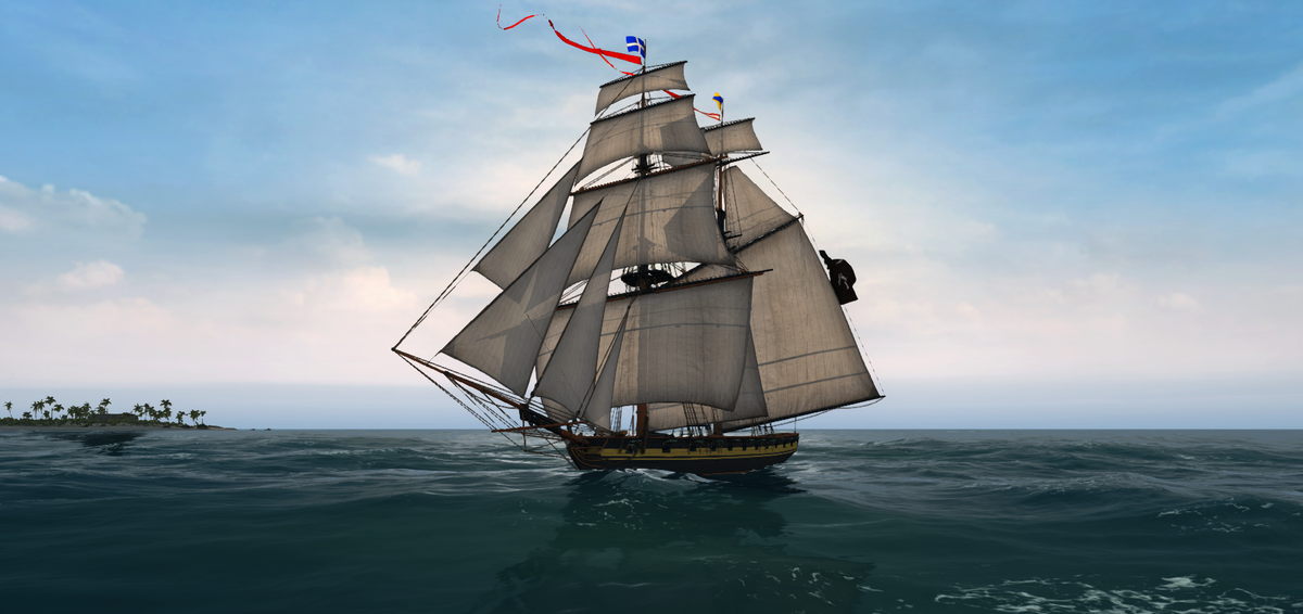 Корабль сохраняет ход даже на острых углах к ветру (75–285°), что позволяет уходить от большинства преследователей. Просто развернитесь против ветра — 99% кораблей вас не догонят.