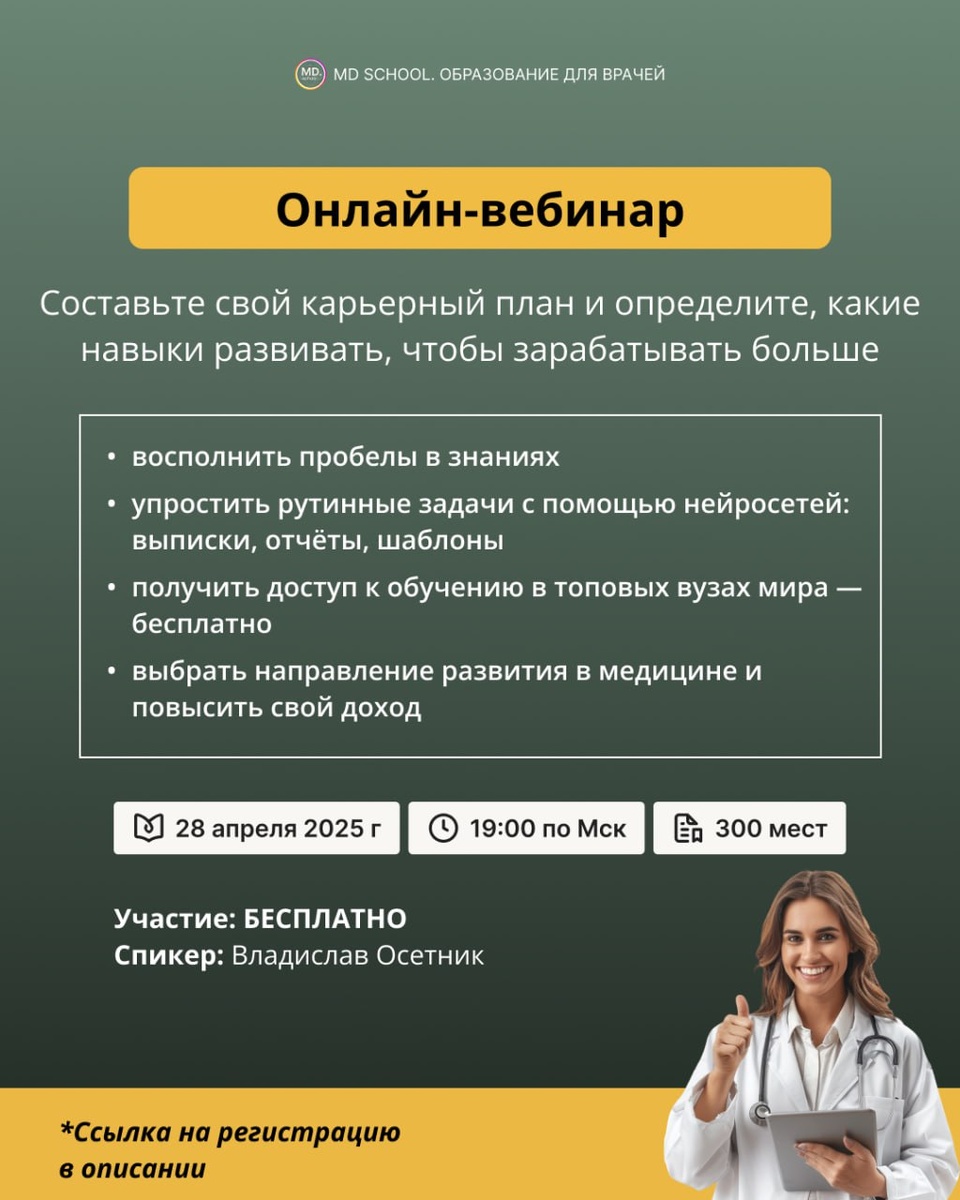 💡 Уже в понедельник, 28 апреля в 19:00 (МСК) — бесплатный вебинар, где разберем, какие карьерные направления в медицине доступны прямо сейчас — и как они помогут зарабатывать больше 💰