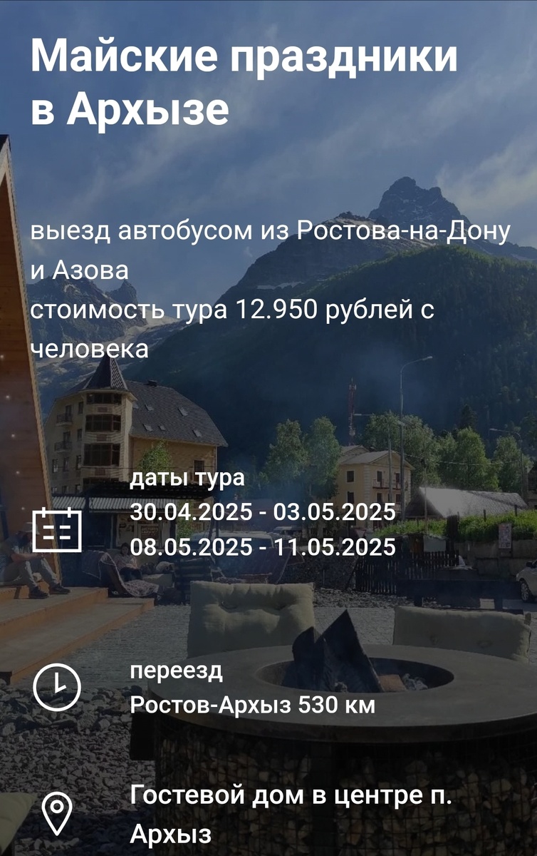 Вот такая программа нас ожидает 30.04.25/08.05.25 Выезд из Азова в 20:30 (сбор в 20:15), Ул. Ленинградская 58 Выезд из Ростова в 21:30 (сбор в 21:15) ул.Серафимовича/уг.Буденновского. 01.05.25/09.05.25 Прибытие в Архыз и раннее заселение в гостиницу. Отдых. Экскурсия в пос. Романтик-Архыз. Подъем на канатных дорогах «Млечный путь» и «Северное сияние» на высоту 2.240 метров и 2.339 метров (Северный + Южный склон - за доп. плату: взрослый – 1.850 руб., детский – 1.250 руб.) Прогулка к водопаду Альтаир от финишной точки канатной дороги Северного склона. Обед наверху с панорамным видом и столиками на улице (за доп.плату). Пеший спуск по тропе Романтик по хвойным пихтовым лесам и альпийским лугам к курортному поселку. Точка старта: 2.240 метров, точка финиша - п. Романтик 1.650 метров, длина тропы - 4 км. Для желающих поездка на джипах к Белому водопаду (за доп. плату – 1. 200 руб.) или посещение фермы Альпак (за доп. плату – 1.000 руб.) Возвращение в гостиницу. Свободное время. 02.