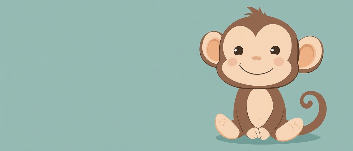 Создано на основе запроса: adorable cartoon monkey sitting, minimalist children's illustration, soft hand-drawn style, simple clean lines, muted earthy colors, teal blue background, friendly and cute expression, designed for kids towel print, spacious composition for wide layout
