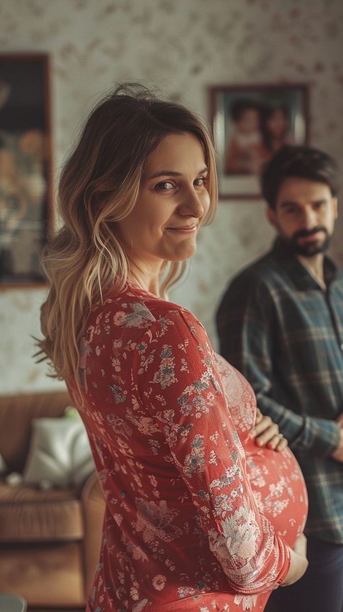 Создано на основе запроса: Pregnant woman secretly smiling slyly behind husband’s back, husband consoling the nanny awkwardly, wealthy