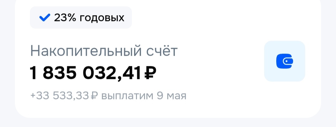 Все таки вернусь к миллиону. Нет, про него не забыла и даже не потеряла🤭 Все на месте и голова и сам мильон. Вернемся к истокам . Пока думала нужна нам ипотека или нет, "играла" калькулятором Сбера. Сначала хотела один миллион отправить на досрочное погашение ипотеки в день закрытия вклада, но, взяв в руки калькулятор передумала. Ведь Озон банк предлагал накопительный до двух месяцев под 23% годовых! Это же огромные деньги. Почему ДО двух месяцев. У меня расчётный день 9 число каждого месяца и чтобы получить проценты за полный месяц, нужно пополнить счет накануне. Так как у меня деньги появились только 9 апреля, то я потеряла один день процентов.Но за второй месяц должны выплатить в полном объёме. На накопительном счете в Озон банке разместила тот самый миллион и деньги , которые мы копим на ремонт. В новой квартире будут стены с соседями, окна и входная дверь🤭, так что денег надо не просто много, а очень много. 9 мая ожидаю выплаты процентов в размере 33 533 руб., где 18 274 р
