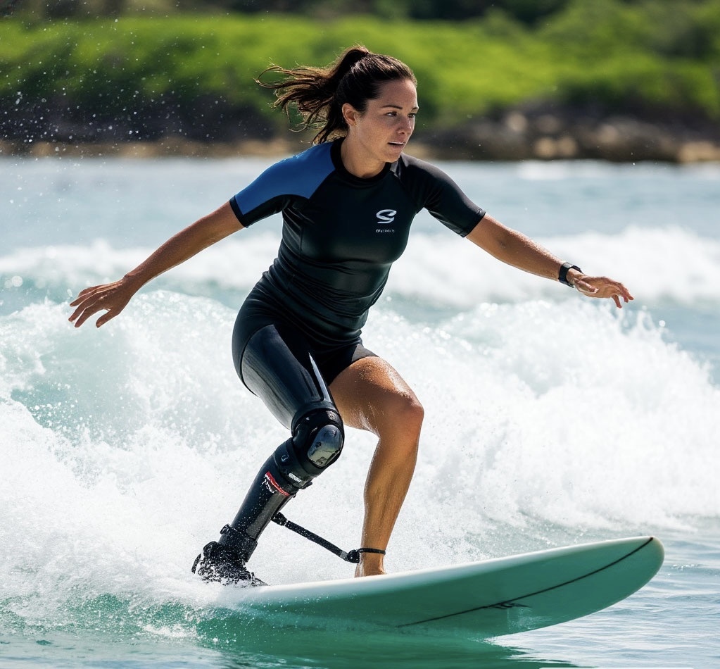 Во время катания на доске мой протез натирает мне кожу, поэтому я всегда снимаю его, как только выхожу из воды.