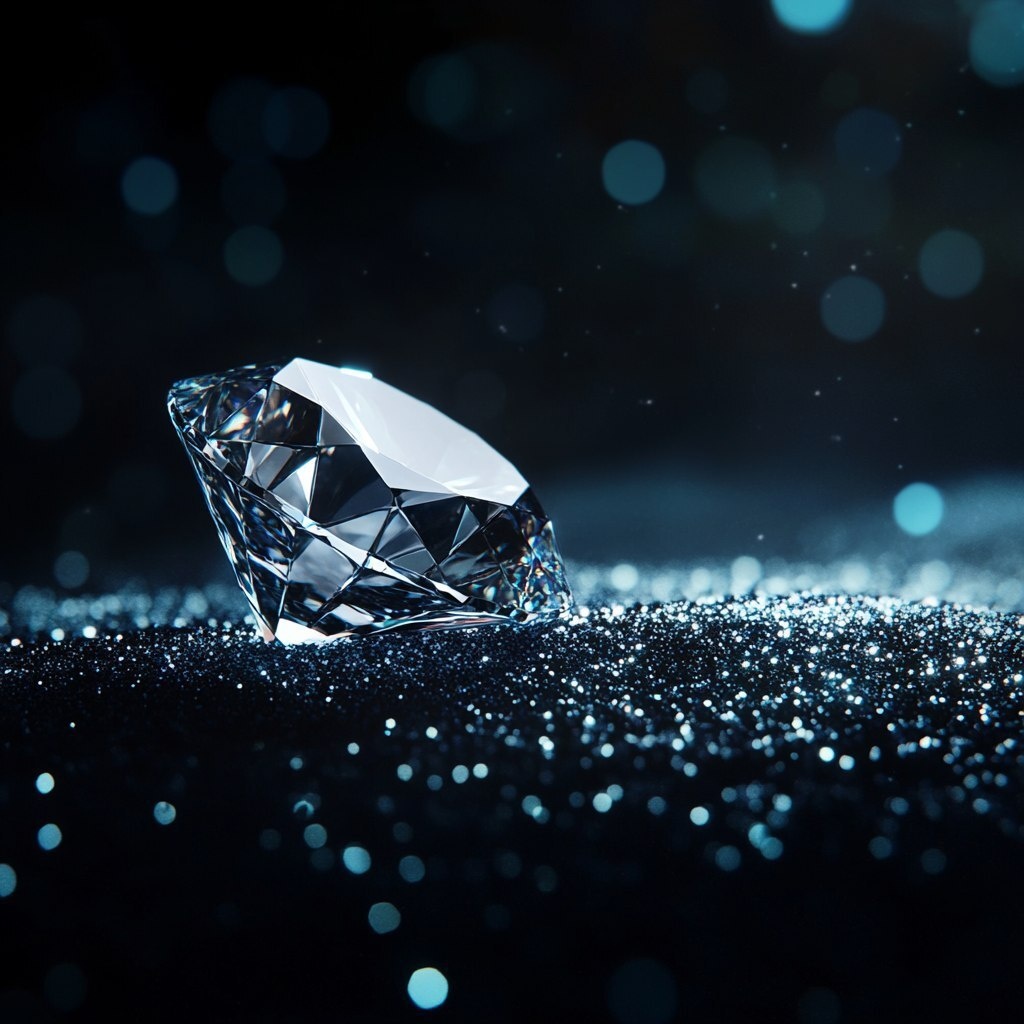 Создано на основе запроса: A highly realistic digital artwork of a single cut diamond resting on a dark glittery surface, illuminated by soft studio lighting. Tiny glittering particles are scattered across the surface, creating a luxurious and ethereal atmosphere. The background is deep black with cold blue and silver highlights, featuring subtle bokeh effects. The diamond casts a soft shadow, with sharp reflections and brilliant clarity. Focus on realism, elegant and minimalistic composition, cinematic lighting, no text, no watermark