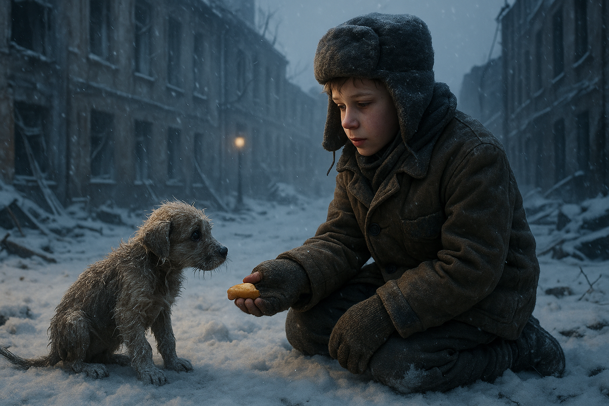 основано на реальных историях детей блокады Декабрь 1942-го был особенно жестоким. Снег ложился на серые улицы Ленинграда не празднично, а словно укрывал мертвецов. Здания, иссечённые осколками, стояли, будто огромные надгробья, в свете бледных фонарей. Юрка шёл, зажав в варежке свернутый кусок хлеба — целых 125 граммов жизни. Его тонкие пальцы дрожали не только от холода. Этот хлеб был не просто едой — он был маминым завтраком, его собственным обедом и, возможно, последней надеждой на то, чтобы дожить до весны. Каждый шаг давался с трудом. Под подошвами скрипел лёд, ветер рвал старенькую шапку с головы. На перекрёстках валялись обледеневшие обломки — брошенные санки, полусломанные двери, которые когда-то были частью чьего-то дома. Он шёл, щурясь от ветра, когда заметил: в подворотне что-то шевельнулось. Это был щенок. Совсем крошечный, грязный, похожий больше на комок тряпья, чем на живое существо. Его шерсть слиплась в ледяные сосульки. Он тянулся к Юрке, дрожа всем телом. Один глаз