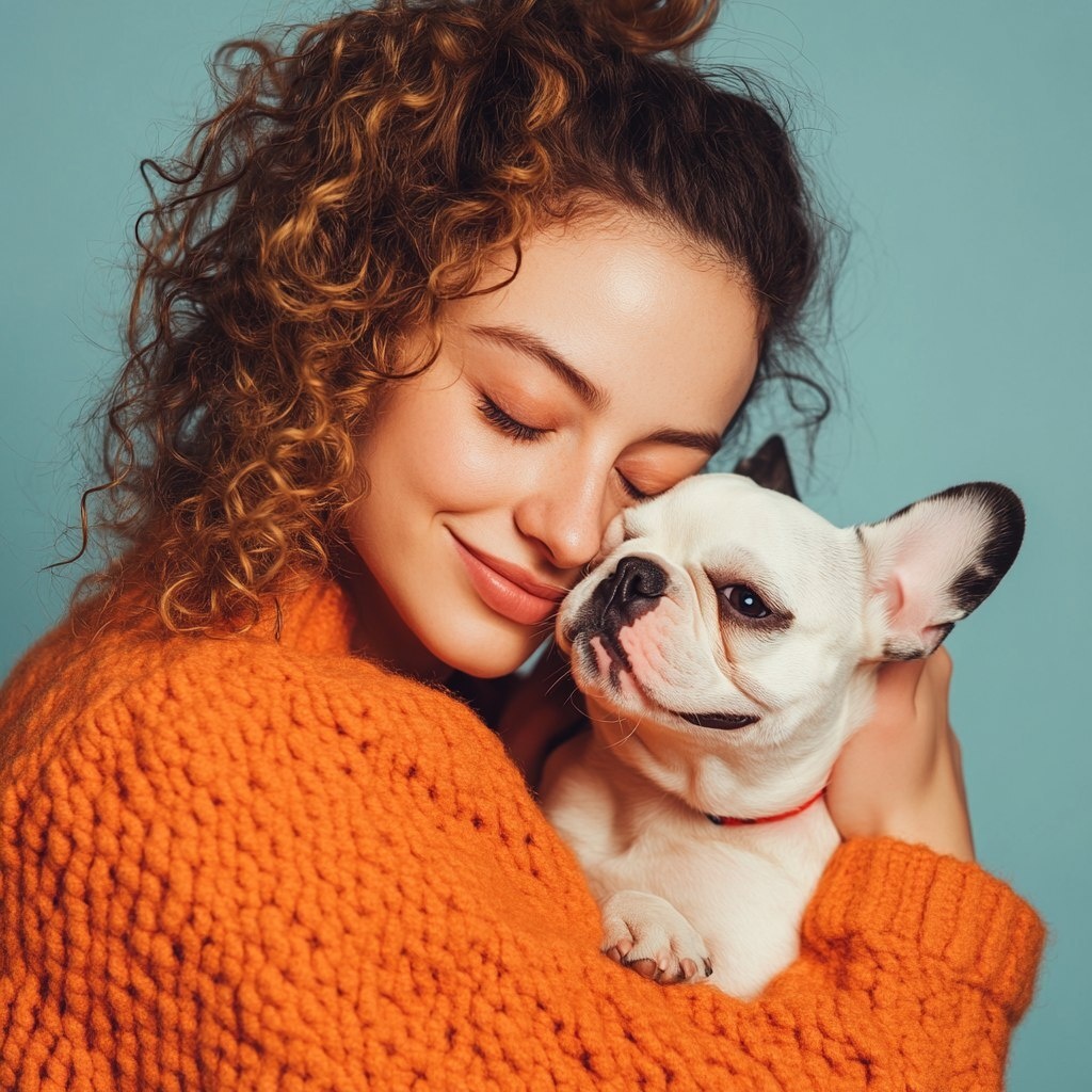 Создано на основе запроса: A light-skinned European (Lithuanian) young woman with natural curly brown hair, wearing a bright orange cozy sweater, holding a small white French bulldog with black patches. They are touching noses affectionately, both smiling warmly. Minimalist light blue background. Soft natural lighting. Focus on a joyful, tender connection between human and dog. Image aspect ratio 1600x623 px. --- Автоперевод: Светлокожая европейская (литовская) молодая женщина с натуральными вьющимися коричневыми волосами, одетая в ярко-оранжевый уютный свитер, держащий маленький белый французский бульдог с черными пятнами. Классно получилось? 🤔 https://dzen.ru/id/65c0c65c86e4f837c27b24d7 #ИИ #AI #нейросеть #midjourney #art