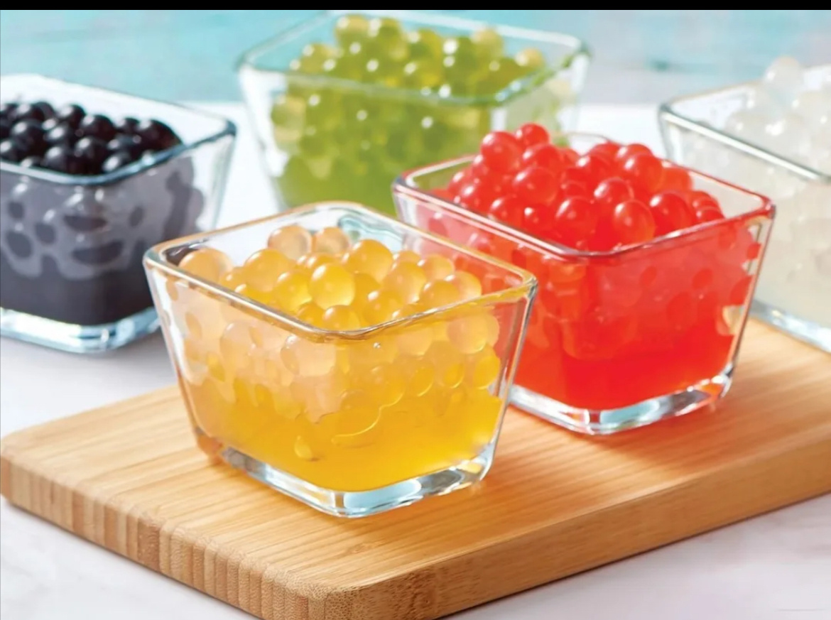 - **Как сделать:** Смешайте специальный порошок (натрий альгинат) с соком. Потом капните эту смесь в раствор другой соли (кальция лактата) — и сок превратится в маленькие желейные шарики.