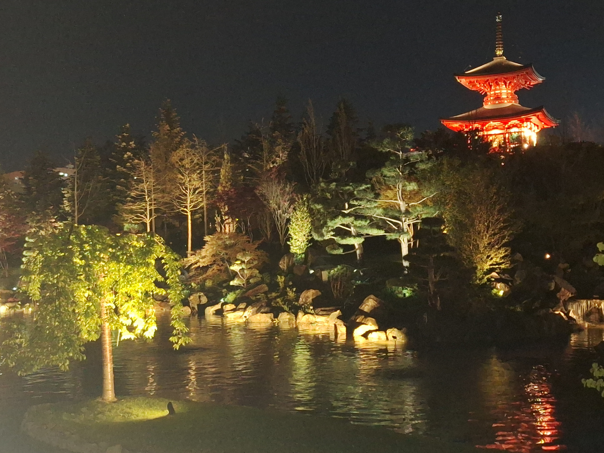В этот раз в Краснодар мы планировали повезти дочку. Она очень любит и узучает восточную культуру, поэтому посещение Японского сада было обязательным в нашей программе. Стоять в очереди весь день не хотелось, поэтому я заранее через интернет приобрела 3 сертификата на посещение кофейни "Киссатен". Нам обошлось это в 4500р(1500р. с человека). Что дает сертификат? После покупки сертификата вам в WhatsApp придет два QR-кода. Первый, QR-код для входа в сад, начнет действовать за час до времени посещения кофейни. Второй код - это сертификат, который вы предъявляете в кофейне. В парк мы приехали за 40 минут до действия сертификата. В Японский сад мне удалось взять сертификат только на 21.00, поэтому знакомство с садом у нас будет при свете софитов. Парк был создан при поддержке посольства Японии. На строительство ушло 1,5 года. Вход в парк осуществляется через Ворота Карамон. Они выполнены в стиле карахафу. Пройдя ворота мы оказались в сухом ландшафтном саду Карэ